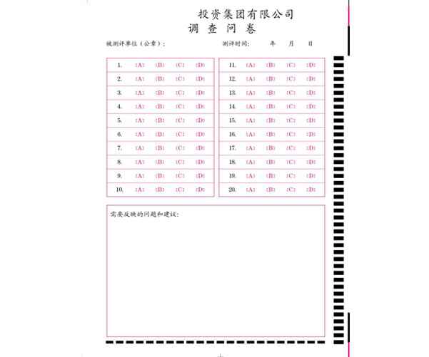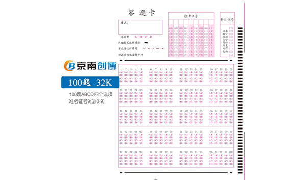答題卡(又稱信息卡),是光標(biāo)閱讀機(jī)輸入信息的載體,是配套光標(biāo)閱讀機(jī)的各種信息錄入表格的總稱。信息卡將用戶需要的信息轉(zhuǎn)化為可選擇的選項(xiàng),供用戶涂寫(xiě)。OMR設(shè)備根據(jù)信息點(diǎn)的涂與未涂和格式文件設(shè)置將信息還原。